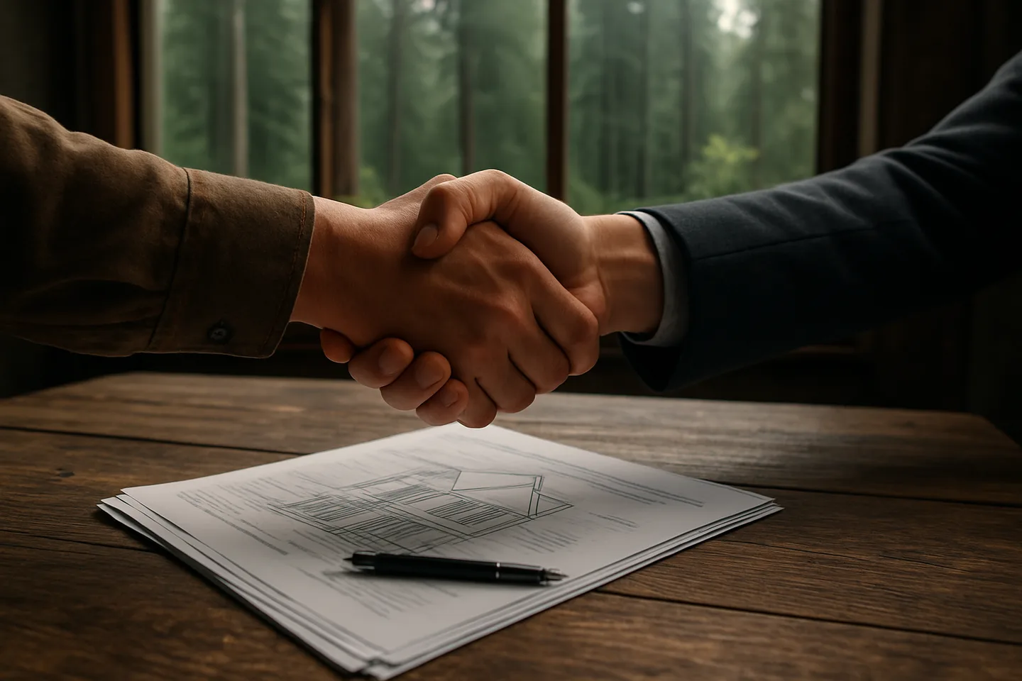 Two people reviewing land sale documents without a realtor